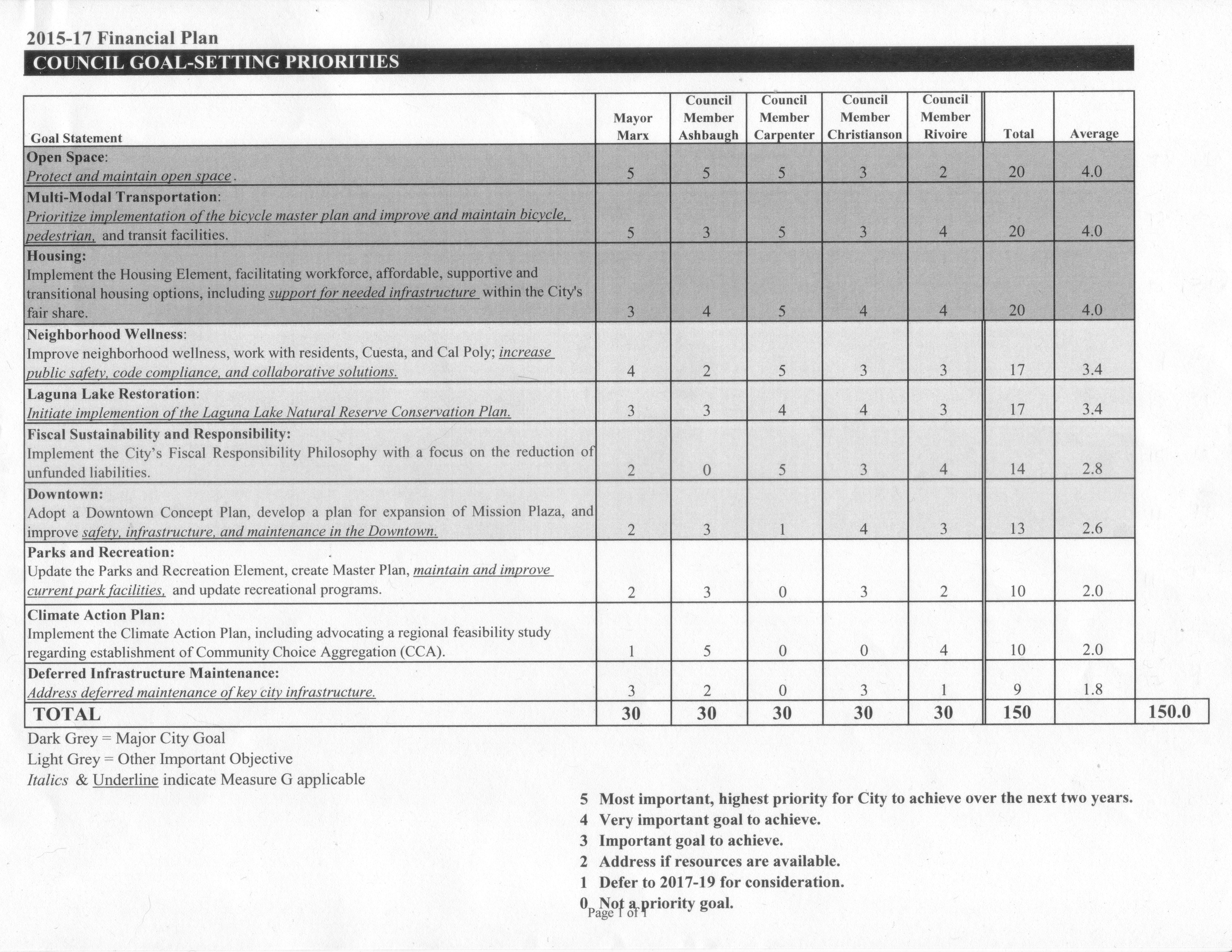 Regarding Neighborhood Wellness, you will notice that Council Member Carpenter voted it as a most important, highest priority goal, Mayor Marx voted it a very important goal, Council Members Christianson and Rivoire voted it an important goal, and Council Member Ashbaugh voted to address Neighborhood Wellness if resources are available.
